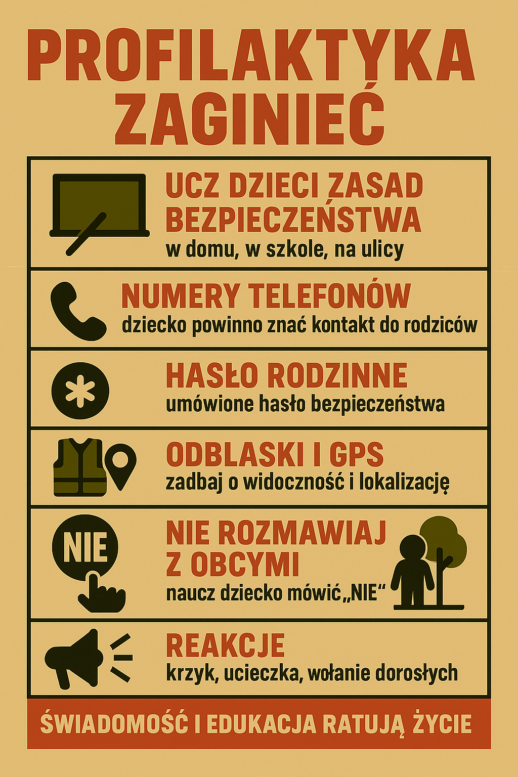 w sytuacji zagrożenia należy krzyczeć, uciekać, zwrócić uwagę otoczenia, szukać pomocy u dorosłych, powiadomić rodziców lub policję,